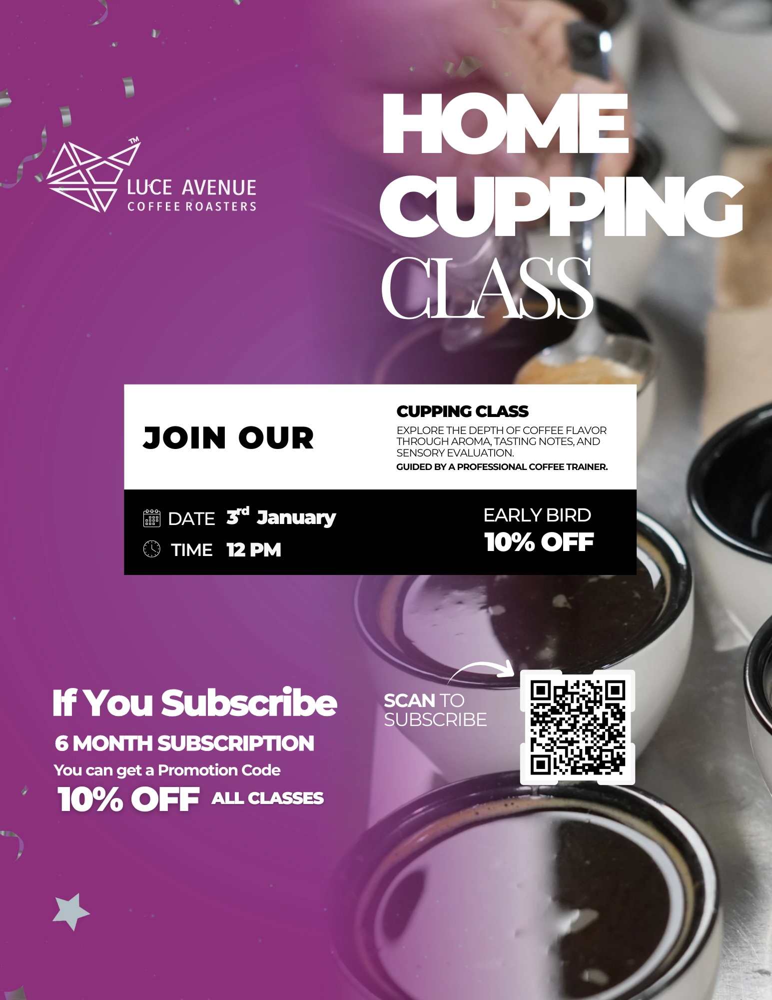 Discover the art of tasting coffee in our Cupping Class at Luce Avenue Coffee Roasters. Guided by our experienced roasters, you’ll explore the sensory process professionals use to evaluate aroma, flavor, and body from the first bloom to the final sip.